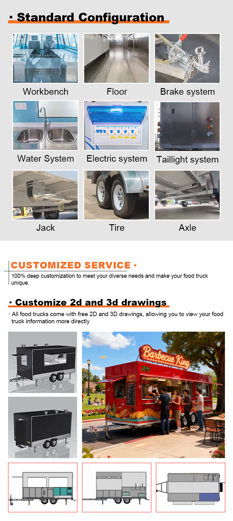 Como material principal, elegimos acero inoxidable 304 de alta calidad, conocido por su excelente resistencia a la corrosión y excelente durabilidad, y puede mantener un rendimiento estable en una variedad de condiciones ambientales, lo que garantiza que nuestros productos de remolques para catering de alimentos puedan mantener su excelente calidad y funcionalidad incluso a largo plazo y enfrentar una variedad de desafíos. La excelente resistencia a la corrosión del acero inoxidable 304, por lo que el camión no se ve afectado fácilmente por la oxidación o el óxido, lo que prolonga enormemente su vida útil. La excelente resistencia a la corrosión del acero inoxidable 304 hace que el camión sea menos susceptible a la oxidación, lo que prolonga enormemente su vida útil.