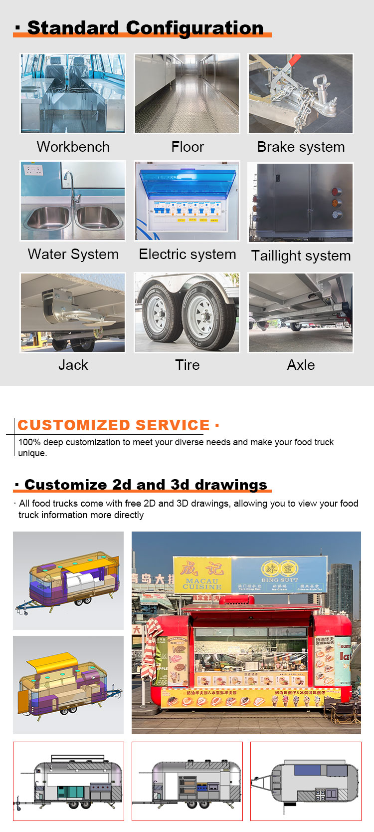 Como material principal, elegimos acero inoxidable 304 de alta calidad, conocido por su excelente resistencia a la corrosión y excelente durabilidad, y puede mantener un rendimiento estable en una variedad de condiciones ambientales, lo que garantiza que nuestros productos de remolques para catering de alimentos puedan mantener su excelente calidad y funcionalidad incluso a largo plazo y enfrentar una variedad de desafíos. La excelente resistencia a la corrosión del acero inoxidable 304, por lo que el camión no se ve afectado fácilmente por la oxidación o el óxido, lo que prolonga enormemente su vida útil. La excelente resistencia a la corrosión del acero inoxidable 304 hace que el camión sea menos susceptible a la oxidación, lo que prolonga enormemente su vida útil.