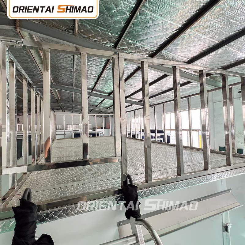 En cuanto al diseño del suelo, es aún más ingenioso, adoptando una estructura de tres capas para conseguir múltiples efectos protectores. La capa inferior está hecha de plástico reforzado con fibra de vidrio (FRP), que tiene un excelente rendimiento a prueba de agua y humedad, bloqueando eficazmente la entrada de humedad del suelo en el interior del camión de comida; la capa intermedia está hecha de tablas de madera resistentes a los insectos importadas de Australia, que están especialmente tratadas con una función natural resistente a los insectos, creando una sólida línea de defensa para la seguridad alimentaria; y la capa superior está pavimentada con tableros de aluminio duraderos, que no solo son antideslizantes y resistentes al desgaste, sino que también mejoran la estética general y la durabilidad, asegurando que los comensales puedan disfrutar de su comida de la mejor manera posible. La capa superior está cubierta con una placa de aluminio resistente y duradera, que no solo es antideslizante y resistente al desgaste, sino que también mejora la estética general y la durabilidad, garantizando la seguridad y comodidad de los comensales al disfrutar de su comida.