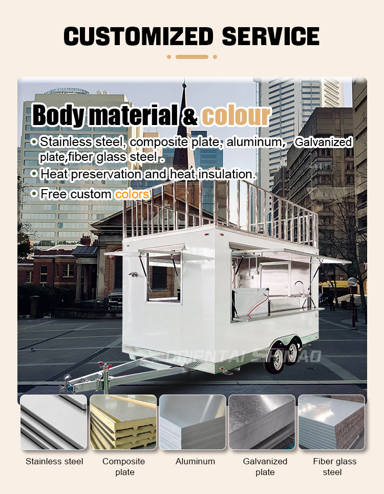 Personalización del material: La elección del material está directamente relacionada con la durabilidad, estética y seguridad del food truck. Ofrecemos una amplia gama de materiales para la carrocería, desde una aleación de aluminio duradera hasta fibra de carbono liviana, desde el clásico acero inoxidable hasta materiales compuestos que ahorran energía, cada uno con sus propias ventajas y escenarios de aplicación únicos. Mientras tanto, también prestamos atención a los detalles, ya sea el material de las ruedas, la robustez del marco de tracción o la comodidad del gato, lo personalizaremos según sus necesidades reales para garantizar que cada parte del camión de comida pueda lograr el rendimiento óptimo.