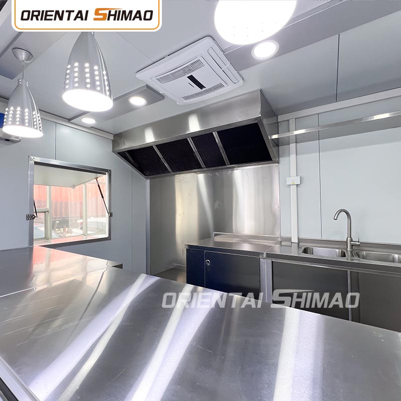 Disposición interior: Planificación razonable de la cocina, el comedor, el área de almacenamiento y otras áreas para garantizar el máximo uso del espacio. Al mismo tiempo, se configuran diferentes áreas funcionales según las necesidades del negocio, como área de producción, área de calefacción, área de venta, etc., para facilitar la operación y mejorar la eficiencia operativa.