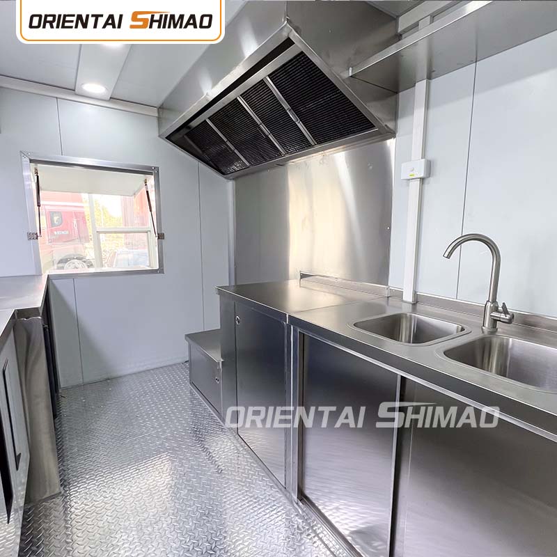 Interior de acero inoxidable: El interior está fabricado en acero inoxidable, lo que garantiza un interior resistente y duradero, fácil de limpiar y mantener y que cumple con los estándares de higiene alimentaria. El uso de acero inoxidable no sólo mejora la vida útil del food truck, sino que también garantiza la higiene y seguridad del proceso de preparación de alimentos.