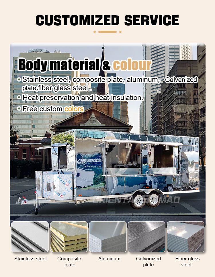 Como material principal, elegimos acero inoxidable 304 de alta calidad, conocido por su excelente resistencia a la corrosión y excelente durabilidad, y puede mantener un rendimiento estable en una variedad de condiciones ambientales, lo que garantiza que nuestros productos Food Caravans puedan mantener su excelente calidad y funcionalidad incluso a largo plazo y enfrentar una variedad de desafíos. La excelente resistencia a la corrosión del acero inoxidable 304, por lo que el camión no se ve afectado fácilmente por la oxidación o el óxido, lo que prolonga enormemente su vida útil. La excelente resistencia a la corrosión del acero inoxidable 304 hace que el camión sea menos susceptible a la oxidación, lo que prolonga enormemente su vida útil.