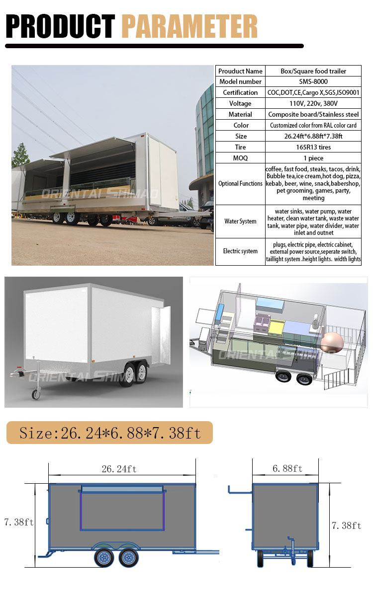 Más importante aún, el enfoque de negocios flexible y versátil de Oriental Shimao Food Trailer de acero inoxidable se adapta perfectamente al ritmo de la vida moderna. Ya sea que se trate de la carrera de almuerzo en el distrito comercial o el tiempo libre por la noche, puede ajustar rápidamente su estrategia para satisfacer las necesidades de catering de diferentes personas en diferentes momentos. Esta adaptabilidad sin precedentes no solo hace que Oriental Shimao Food Trailer de acero inoxidable se destaque en el mercado de catering altamente competitivo, sino que también lo convierte en una fuerza importante que impulsa la innovación y la establecimiento de tendencias en la industria.