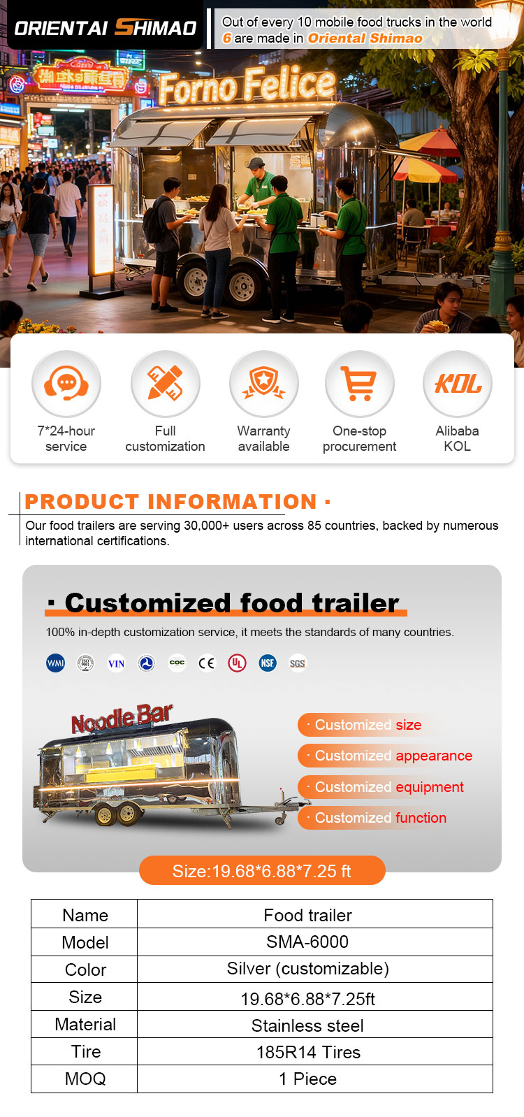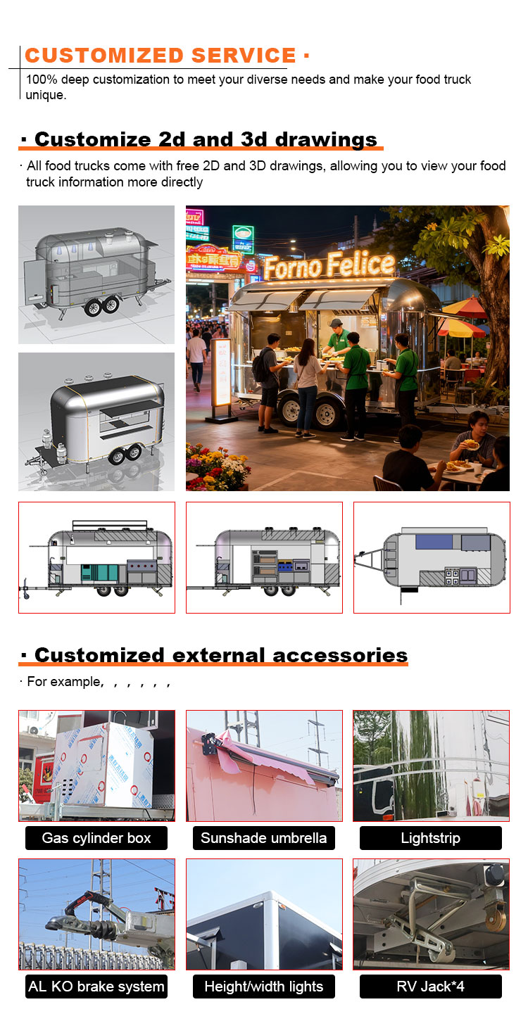 Como material principal, elegimos acero inoxidable 304 de alta calidad, conocido por su excelente resistencia a la corrosión y excelente durabilidad, y puede mantener un rendimiento estable en una variedad de condiciones ambientales, lo que garantiza que nuestros productos de remolques para catering de alimentos puedan mantener su excelente calidad y funcionalidad incluso a largo plazo y enfrentar una variedad de desafíos. La excelente resistencia a la corrosión del acero inoxidable 304, por lo que el camión no se ve afectado fácilmente por la oxidación o el óxido, lo que prolonga enormemente su vida útil. La excelente resistencia a la corrosión del acero inoxidable 304 hace que el camión sea menos susceptible a la oxidación, lo que prolonga enormemente su vida útil.