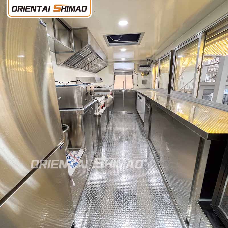 Interior de acero inoxidable: El interior está fabricado en acero inoxidable, lo que garantiza un interior resistente y duradero, fácil de limpiar y mantener y que cumple con los estándares de higiene alimentaria. El uso de acero inoxidable no sólo mejora la vida útil del food truck, sino que también garantiza la higiene y seguridad del proceso de preparación de alimentos.