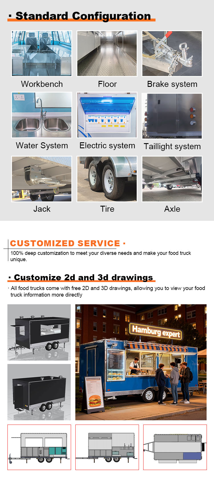 Cabe señalar que la selección del equipo dentro del camión de comida debe basarse en la escala del camión de comida, los proyectos comerciales, la demanda y el presupuesto del cliente y otros factores para una consideración integral. Al mismo tiempo, la instalación y disposición del equipo también debe cumplir con las normas de seguridad y salud pertinentes para garantizar el funcionamiento normal del camión de comida y la seguridad y salud de los clientes.