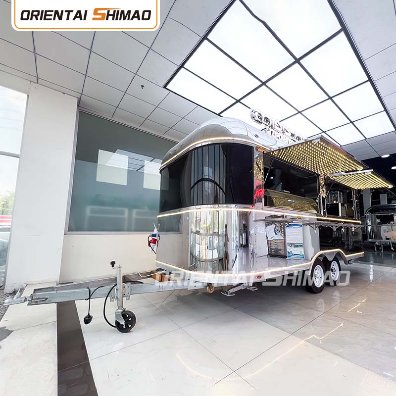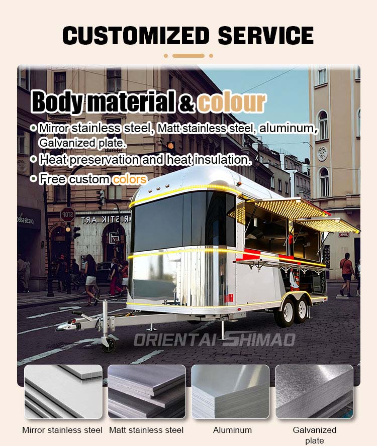 Acero inoxidable dorado: el exterior del food truck está fabricado en acero inoxidable dorado de alta calidad. Este material no solo tiene una excelente resistencia a la corrosión y la abrasión, sino que también su apariencia dorada aumenta la belleza visual y la sensación de alta calidad, de modo que el camión de comida puede destacarse en diversos entornos.