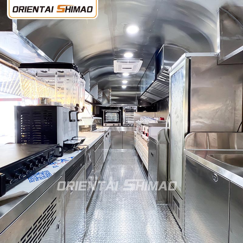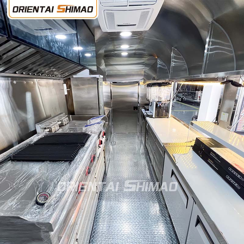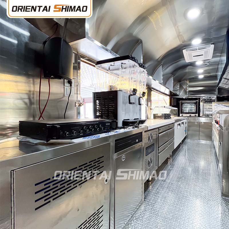 Interior de acero inoxidable: El interior está fabricado en acero inoxidable, lo que garantiza un interior resistente y duradero, fácil de limpiar y mantener y que cumple con los estándares de higiene alimentaria. El uso de acero inoxidable no sólo mejora la vida útil del food truck, sino que también garantiza la higiene y seguridad del proceso de preparación de alimentos.