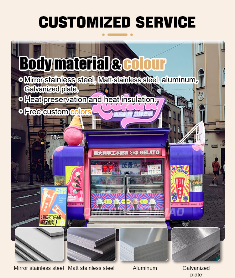 Acero inoxidable dorado: el exterior del food truck está fabricado en acero inoxidable dorado de alta calidad. Este material no solo tiene una excelente resistencia a la corrosión y la abrasión, sino que también su apariencia dorada aumenta la belleza visual y la sensación de alta calidad, de modo que el camión de comida puede destacarse en diversos entornos.