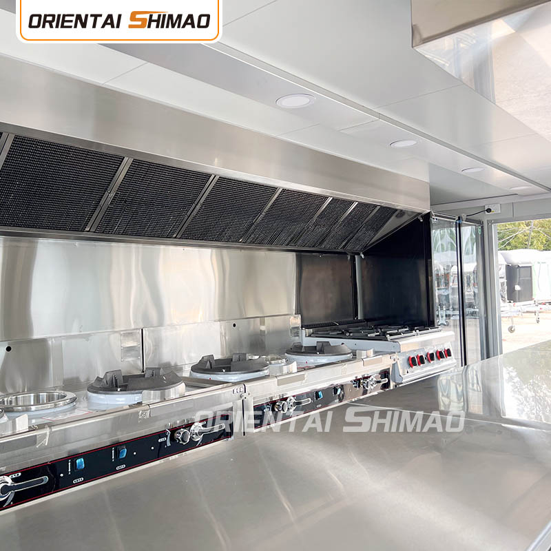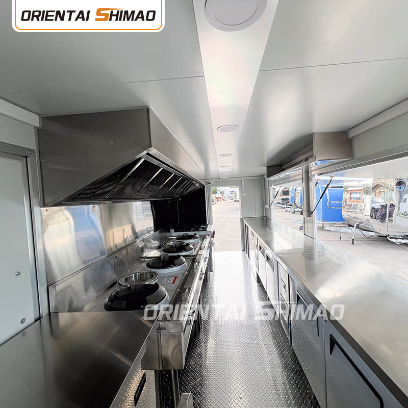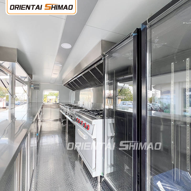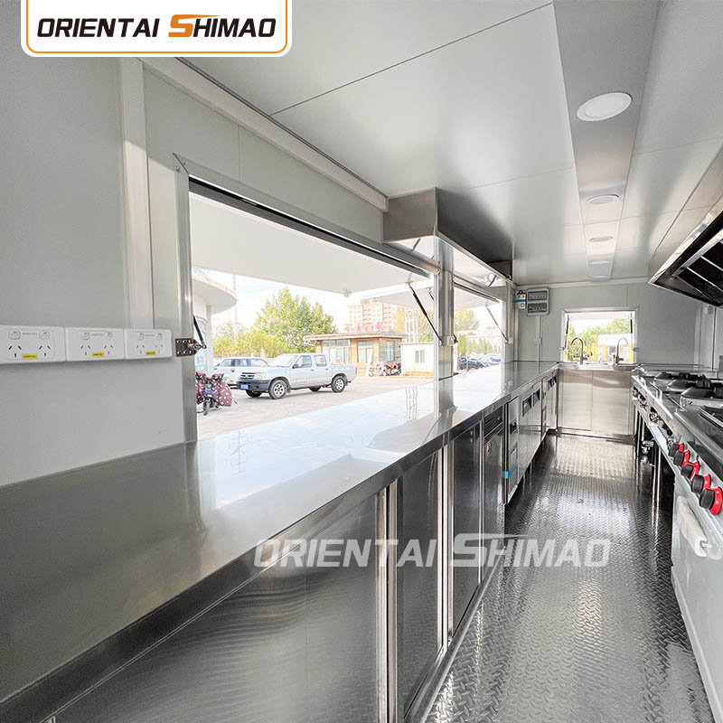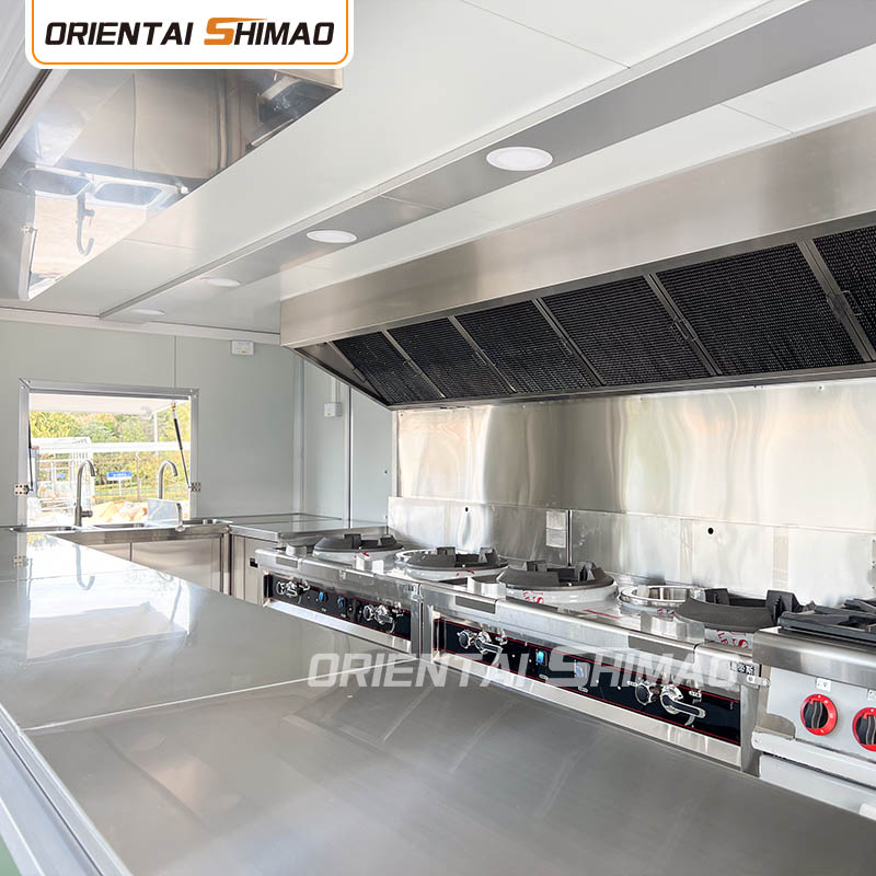Interior de acero inoxidable: El interior está fabricado en acero inoxidable, lo que garantiza un interior resistente y duradero, fácil de limpiar y mantener y que cumple con los estándares de higiene alimentaria. El uso de acero inoxidable no sólo mejora la vida útil del food truck, sino que también garantiza la higiene y seguridad del proceso de preparación de alimentos.