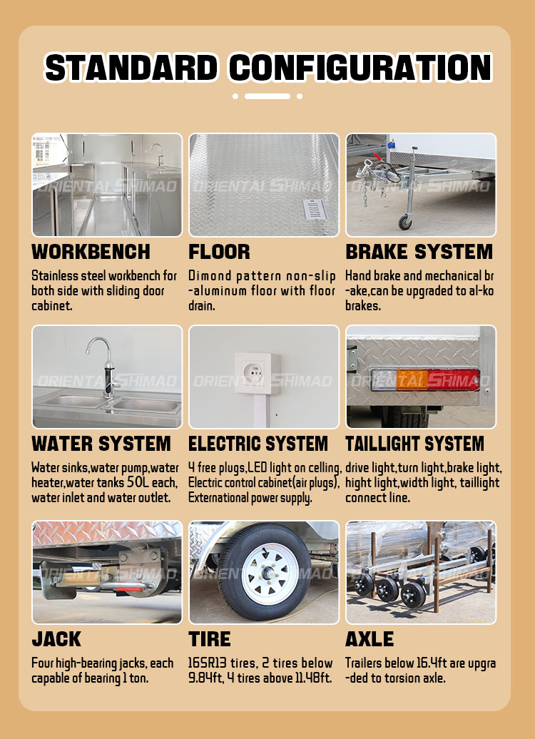 Ruedas y sistema de suspensión: elija ruedas y sistema de suspensión adecuados para las diferentes condiciones de la carretera para garantizar que el camión de comida pueda moverse con facilidad y permanecer estable.