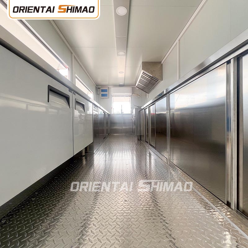 Disposición interior: Planificación razonable de la cocina, el comedor, el área de almacenamiento y otras áreas para garantizar el máximo uso del espacio. Al mismo tiempo, se configuran diferentes áreas funcionales según las necesidades del negocio, como área de producción, área de calefacción, área de venta, etc., para facilitar la operación y mejorar la eficiencia operativa.