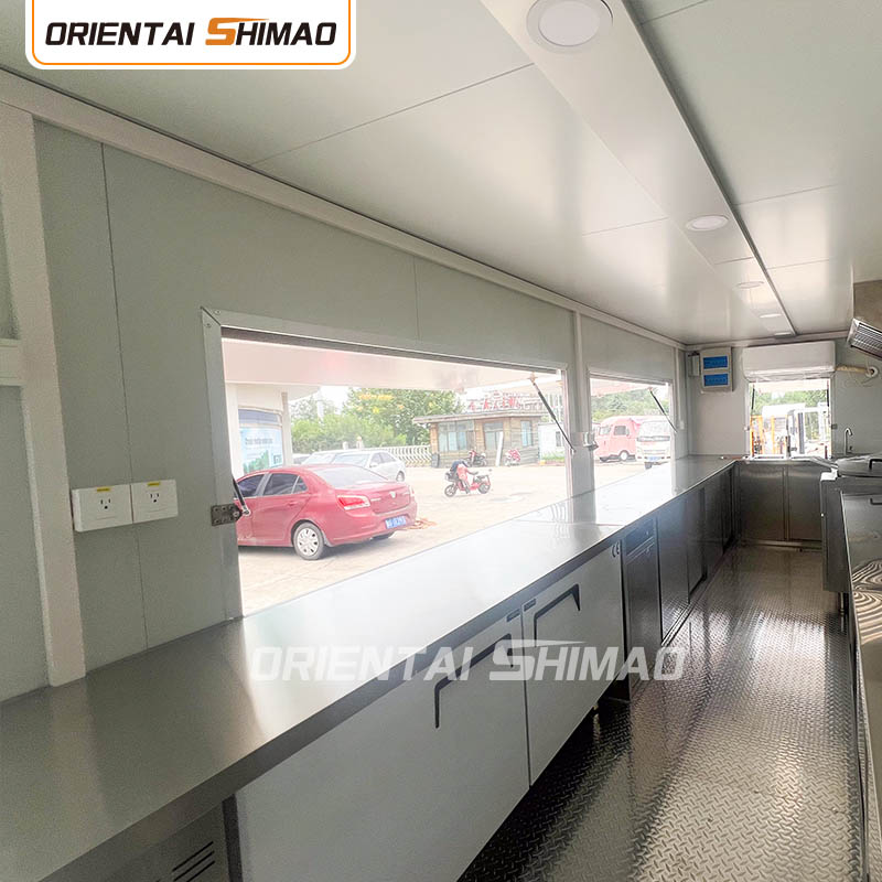 Interior de acero inoxidable: El interior está fabricado en acero inoxidable, lo que garantiza un interior resistente y duradero, fácil de limpiar y mantener y que cumple con los estándares de higiene alimentaria. El uso de acero inoxidable no sólo mejora la vida útil del food truck, sino que también garantiza la higiene y seguridad del proceso de preparación de alimentos.