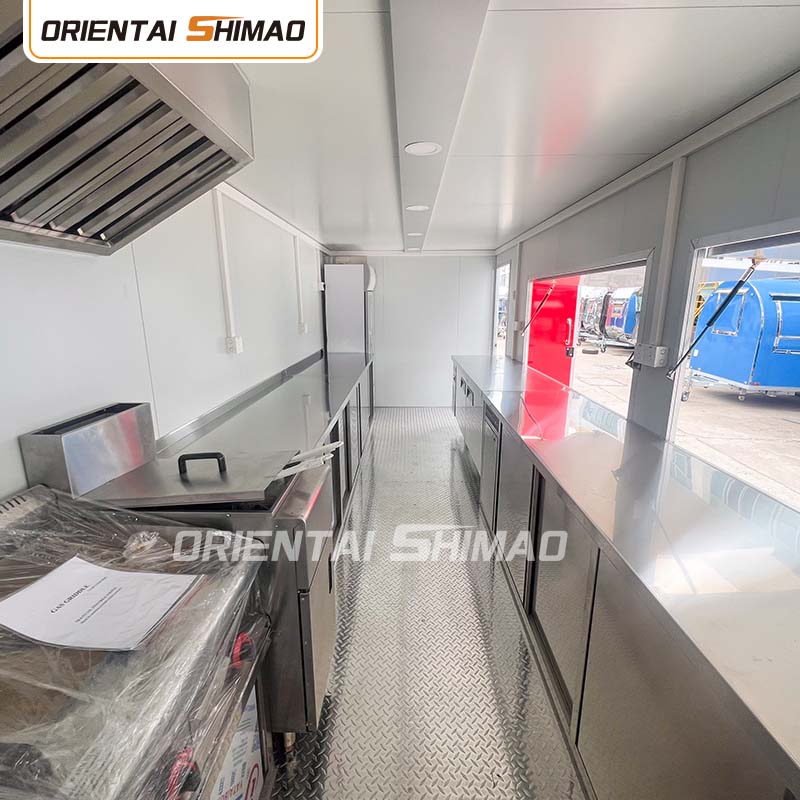 Interior de acero inoxidable: El interior está fabricado en acero inoxidable, lo que garantiza un interior resistente y duradero, fácil de limpiar y mantener y que cumple con los estándares de higiene alimentaria. El uso de acero inoxidable no sólo mejora la vida útil del food truck, sino que también garantiza la higiene y seguridad del proceso de preparación de alimentos.