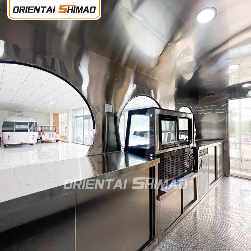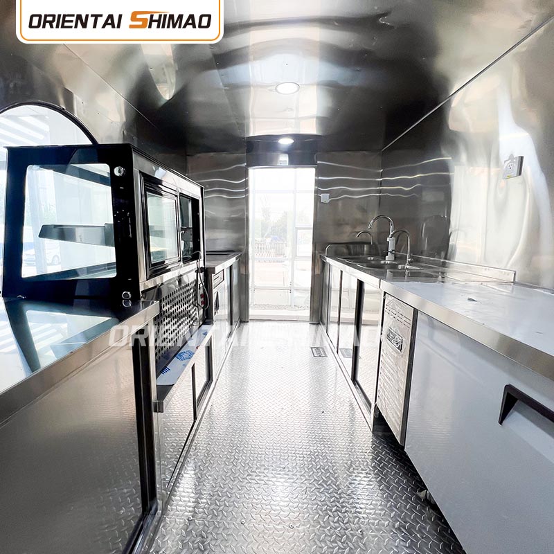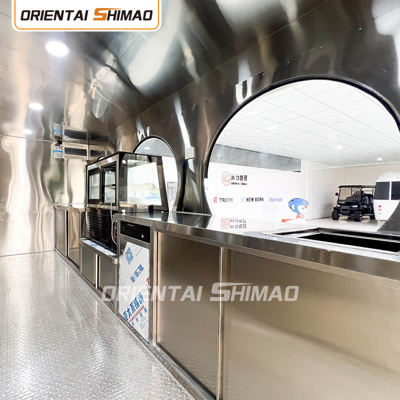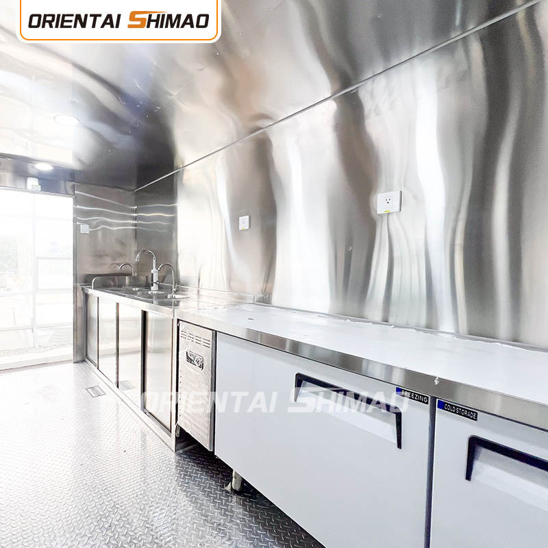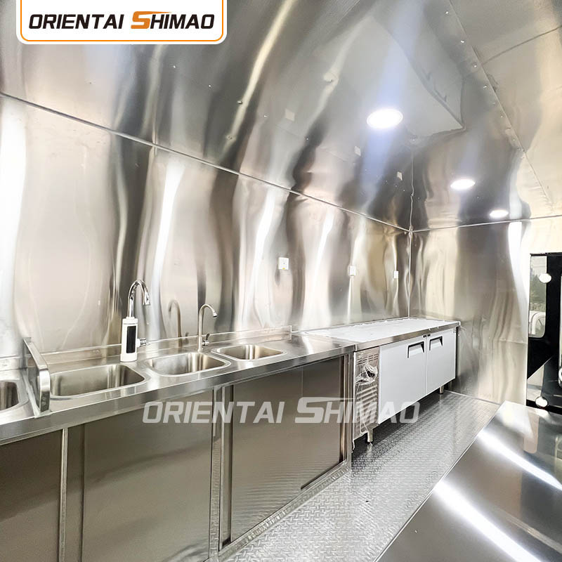 Interior de acero inoxidable: El interior está fabricado en acero inoxidable, lo que garantiza un interior resistente y duradero, fácil de limpiar y mantener y que cumple con los estándares de higiene alimentaria. El uso de acero inoxidable no sólo mejora la vida útil del food truck, sino que también garantiza la higiene y seguridad del proceso de preparación de alimentos.